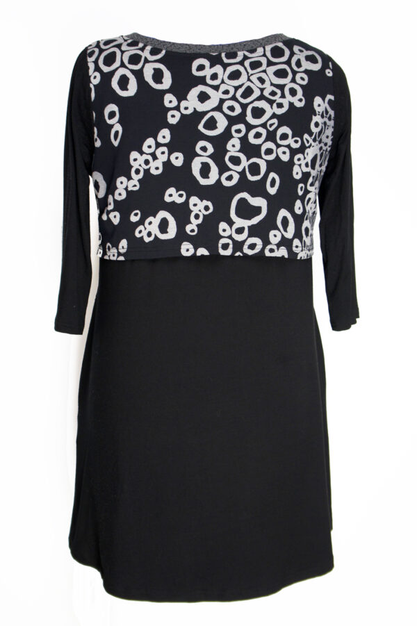 Marjorie is playful, artistic, an so easy to wear. The sweeping lines of contrasting fabrics create movement across the front of the body, which is wonderfully flattering in disguising the tummy. She has a placket panel in the back for hiding bra straps or bulge from bra straps.